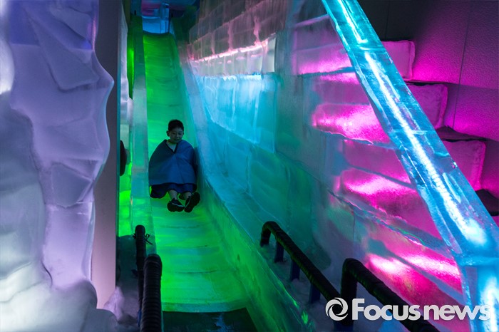 (서울=포커스뉴스) 3일 오후 서울 마포구 아이스뮤지엄을 찾은 한 어린이가 얼음 미끄럼틀을 타고 있다.