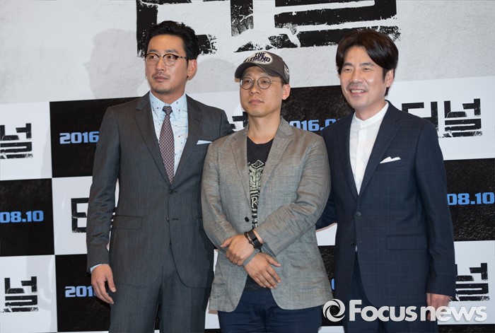 (서울=포커스뉴스) 3일 오후 서울 강남구 메가박스 코엑스점에서 열린 영화 '터널' 언론시사회에 참석한 배우 하정우(왼쪽부터), 김성훈 감독, 오달수가 포토타임을 갖고 있다.