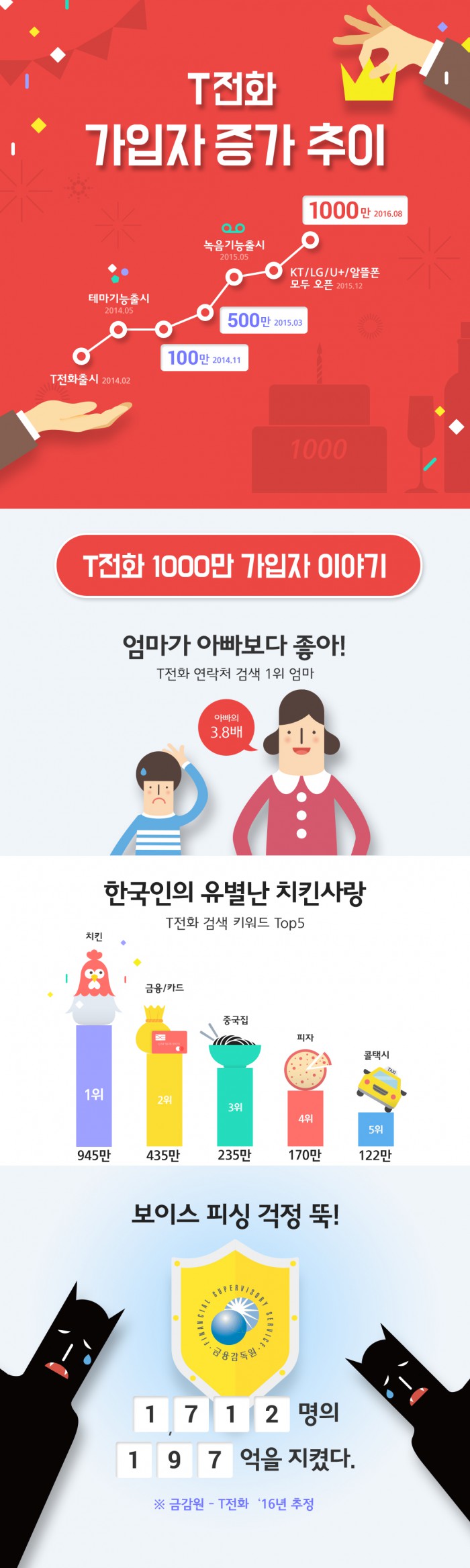 (서울=포커스뉴스) SK텔레콤의 통화플랫폼 ‘T전화’의 가입자가 8일 기준으로 1000만을 넘어섰다. T전화는 사용자들에게 스팸·스미싱 위험번호 알림 및 연락처에 저장되지 않은 상호에 대한 검색, 그룹통화 등 통화의 편의성을 높여주는 통화플랫폼이다.
