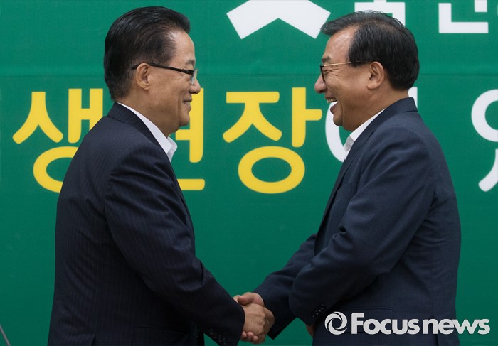 (서울=포커스뉴스) 11일 오후 서울 여의도 국회에서 박지원(왼쪽) 국민의당 비상대책위원장이 이정현 새누리당 대표와 면담에 앞서 인사하고 있다.